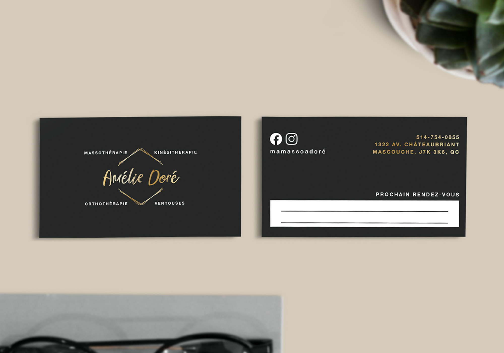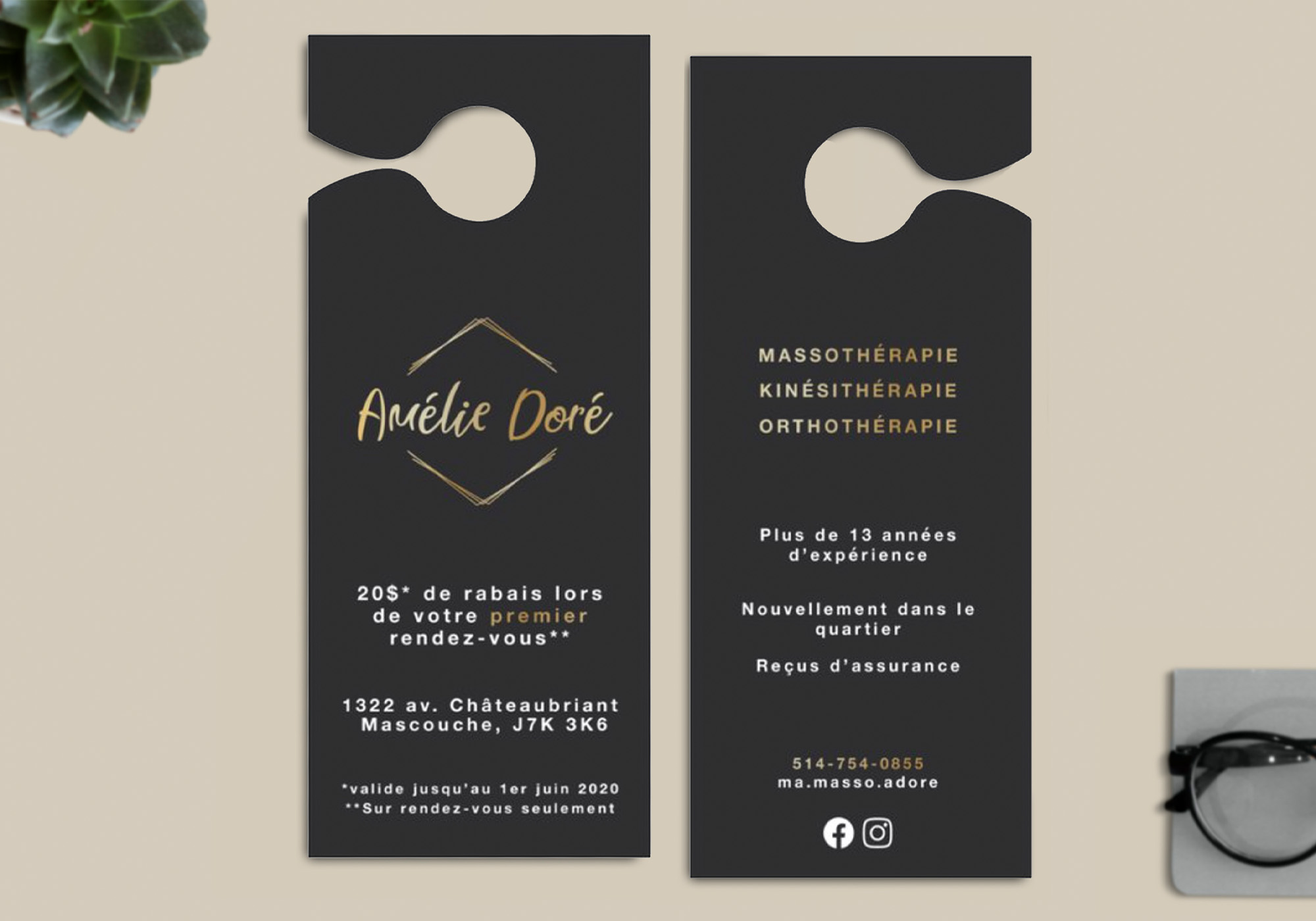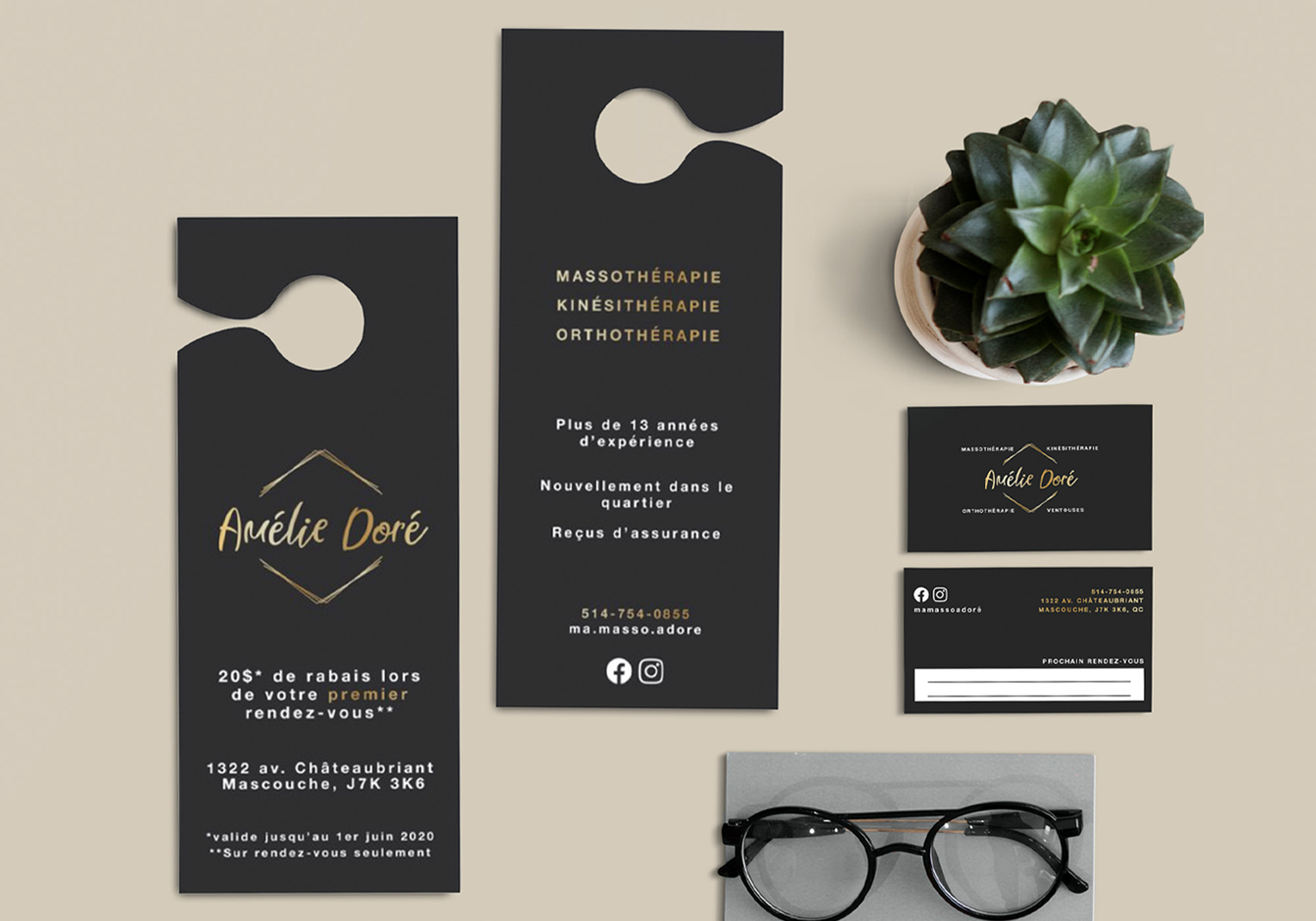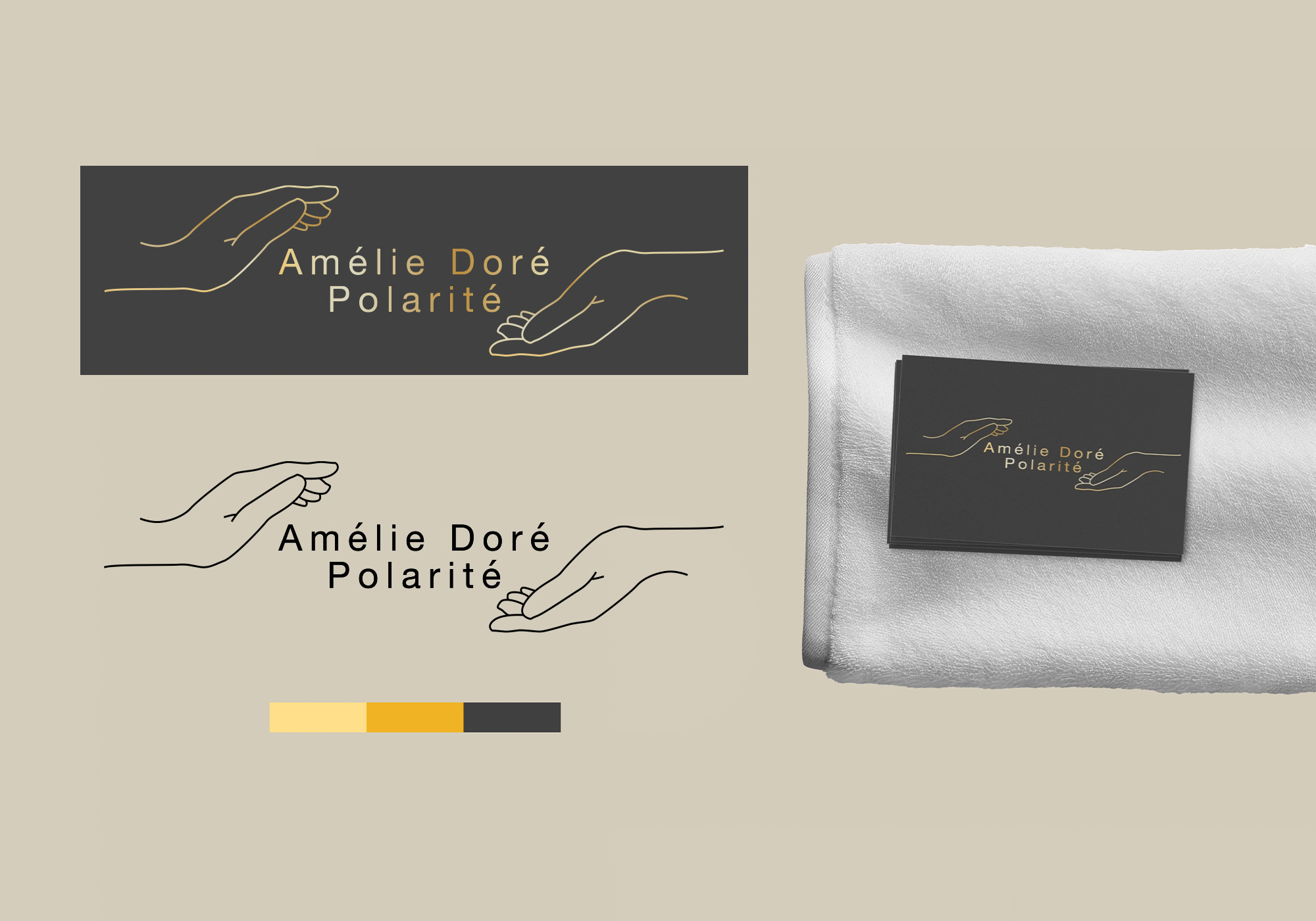 Branding, carte d’affaires, publicités et stickers (vinyles pour voiture et fenêtre de commerce) pour Amélie Doré Orthothérapie spécialisé en thérapie deep tissue & cupping et pour Amélie Doré Polarité.